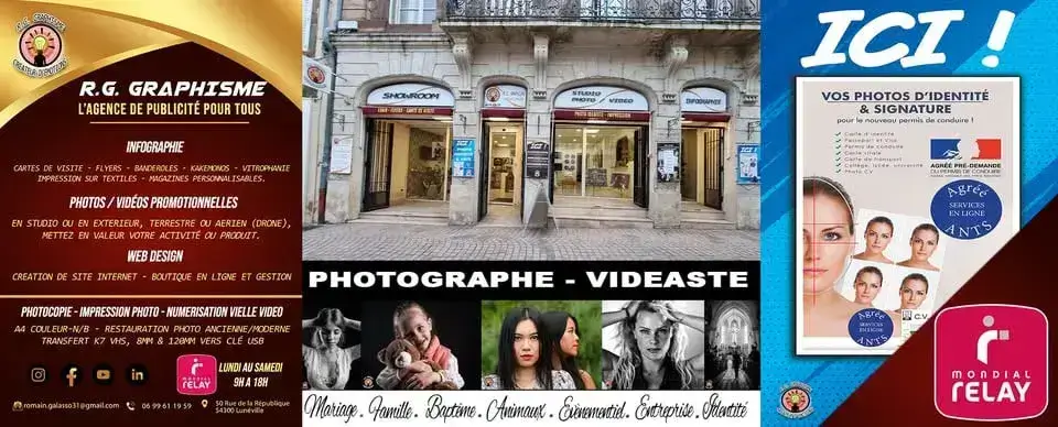Publié sur amina hammouTrustindex vérifie que la source originale de l'avis est Google. Toujours agréable d’avoir des commerçants passionnés et soucieux du travail bien fait …a cela se rajoute un accueil toujours agréable et avec le sourire …je recommande vivementPublié sur PriscilliaTrustindex vérifie que la source originale de l'avis est Google. Je remercie Romain et toute son équipe d'avoir accueilli ma fille en stage et d'avoir pris de son temps pour l'explication des différentes facettes de son métier et de ces tâches quotidiennes. Romain est très professionnel et passionné ! Encore merci pour elle.Publié sur CYRIL JTrustindex vérifie que la source originale de l'avis est Google. Toujours très très bien accueilli LE TOP C EST qu il est dépôt MONDIAL RELAY, avec des ouvertures non stop toute la semaine !! Jusqu'à 18 h !! Boutique qui réalise beaucoup chose : Carte de visite, photos d identité, banderole pub , web design création de site internet. Il y aussi quelques oeuvres d' art !! En Expo avec possibilité d achat !! Photocopie ( rare de nos jours !!) , Studio photo , même en extérieur possible ! Photo aérienne (drone) ....... IL Y A AUSSI UNE CARTE DE FIDÉLITÉ !!! Impression textile, tout support publicitaire !!...... Sur Lunéville il y a une seule adresse pour ça RG GRAPHISME, 50 RUE DE LA RÉPUBLIQUE 54300 LUNÉVILLE.Publié sur Hélène BourgeoisTrustindex vérifie que la source originale de l'avis est Google. Boutique super agréable, accueil toujours souriant et un professionnalisme qui se ressent dans le travail. Au top 👌Publié sur Aurelie HuetTrustindex vérifie que la source originale de l'avis est Google. Un photographe au top ! Très réactif, super sympa et ultra rapide. Nos faire-part de mariage sont magnifiques, nous sommes ravis. On recommande à 100 % !!!Publié sur Virginie BOULALATrustindex vérifie que la source originale de l'avis est Google. Photographe au top ! Il a fait pour moi un superbe travail de reproduction et retouche de photos anciennes 👍 Je recommandePublié sur Priss OuTrustindex vérifie que la source originale de l'avis est Google. Photo d'identité avec un petit pas toujours facile mais là... Un jeu d'enfant pour le professionnel. Reçu avec le sourire et une bonne ambiance je recommande fortementPublié sur HaeronwenTrustindex vérifie que la source originale de l'avis est Google. Excellent travail. Personne à l'écoute du projet des gens et de leur budget. qualité irréprochable accueil chaleureux je recommande RG Graphisme à 100 %.Publié sur Cindy VolffTrustindex vérifie que la source originale de l'avis est Google. Super 👍Certifié par: TrustindexLe badge vérifié de Trustindex est le symbole universel de confiance. Seules les meilleures entreprises peuvent obtenir le badge vérifié, avec une note supérieure à 4.5, basée sur les avis des clients au cours des derniers 12 mois. En savoir plus